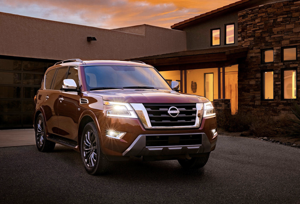 Inside, the center stack has been redesigned with a new standard 12.3-inch touchscreen as its focal point. Wi-Fi and wireless Apple CarPlay are new standard features, and wireless smartphone charging is available. A new 7-inch driver-assist color display in the gauge cluster has higher resolution for better visibility. Included for the first time on Armada within the NissanConnect Services Convenience plan is Nissan Concierge, providing 24-hour access to a live assistant at the push of a button. Every new Armada comes with a burly V8 engine making 400 horsepower and 413 pound-feet of torque, an increase of 10 horsepower and 19 pound-feet over the previous model. A smooth, quick seven-speed automatic transmission is standard across the board. When properly equipped, the Armada is good for towing up to 8,500 pounds, for both rear-wheel and four-wheel drive versions. Fuel economy ratings are a wince-worthy 14 mpg city, 19 mpg highway and 16 mpg combined for 2WD, and 13/18/15 mpg for 4WD. Newly standard active safety features for all models include adaptive cruise control, automatic emergency braking, blind-spot monitoring, rear automatic braking and lane-keeping assist. The 2021 Armada comes in S, SV, SL, and Platinum trim levels, with standard 4×2 or optional 4×4 configuration for each one. Pricing for the S model starts at $50,395 including a $1,495 destination charge.
