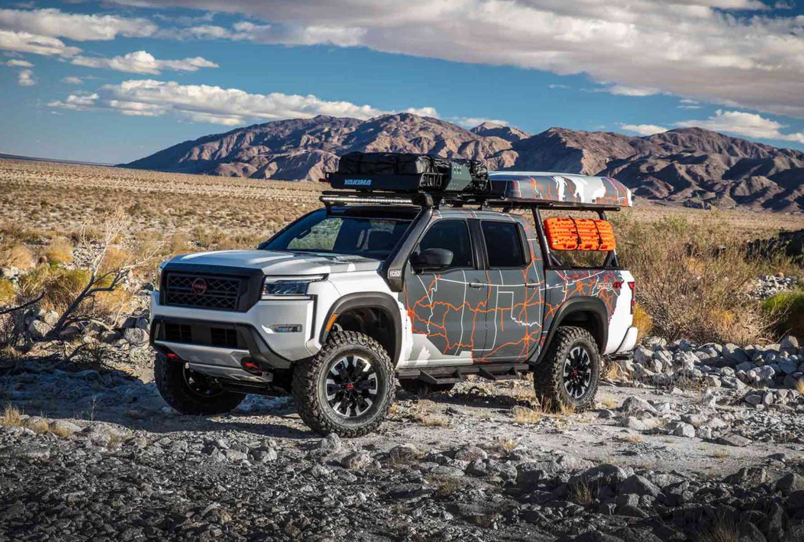 The Project Adventure goes its own overlanding way. Based on the hardest-core Pro-4X trim, it stands tallest with a 5-inch lift packing 34-inch BFG Mud-Terrains, and carries the most thanks to a Yakima LoadWarrior roof basket, SkyRise tent, and Yakima bed rack system. NDA laid up a custom carbon fiber snorkel for fording waterways; Kicker worked up a Bluetooth-enabled speaker system for flinging tunes from the bed. The custom wrap, an atlas of the United States, is a map of everywhere Nissan thinks this truck can go.