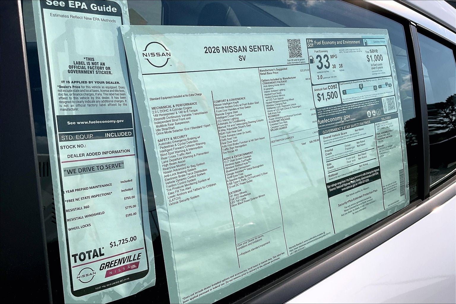 All prices, specifications, and availability are subject to change without notice. Contact dealer for current details. Pricing applies to in-stock units only and includes applicable dealer fees, discounts, and manufacturer incentives. Some offers require financing through NMAC with approved credit; alternative financing may affect eligibility. Due to inventory and market conditions, select vehicles may include a market adjustment. Pricing reflects all applicable incentives and may not be combined with other offers. Most new vehicles may include the Drive to Serve Protection Package, featuring dealer-installed products: 1-Year Prepaid Maintenance, Free NC State Inspections, ResistAll 360 ($755), Windshield Protection ($775), and Wheel Locks ($195, where applicable). These are not factory-installed and are added by Greenville Nissan. Dealer addendum pricing is separate from advertised price and excludes tax, title, license, registration, and dealer fees. See dealer for full details.