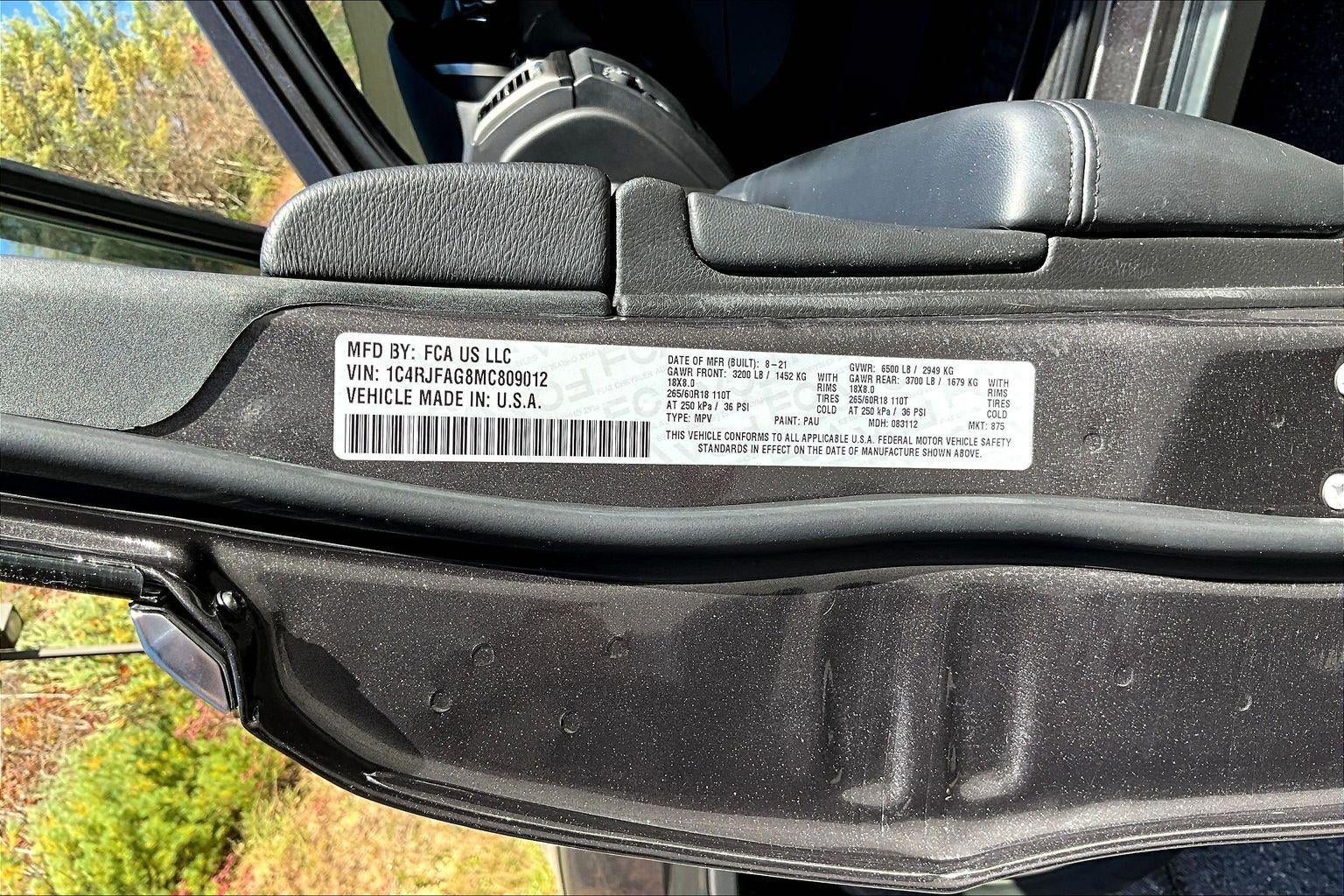 ENGINE: 3.6L V6 24V VVT UPG I W/ESS, TRANSMISSION: 8-SPEED AUTOMATIC (850RE), QUICK ORDER PACKAGE 2BM LAREDO X, WHEELS: 18"" X 8.0"" FINE SILVER ALUMINUM, TIRES: 265/60R18 BSW A/S LRR, GRANITE CRYSTAL METALLIC CLEARCOAT, BLACK, BLACK SUEDE SEATS W/BLACK STITCHING, MOPAR INTERIOR PROTECTION GROUP