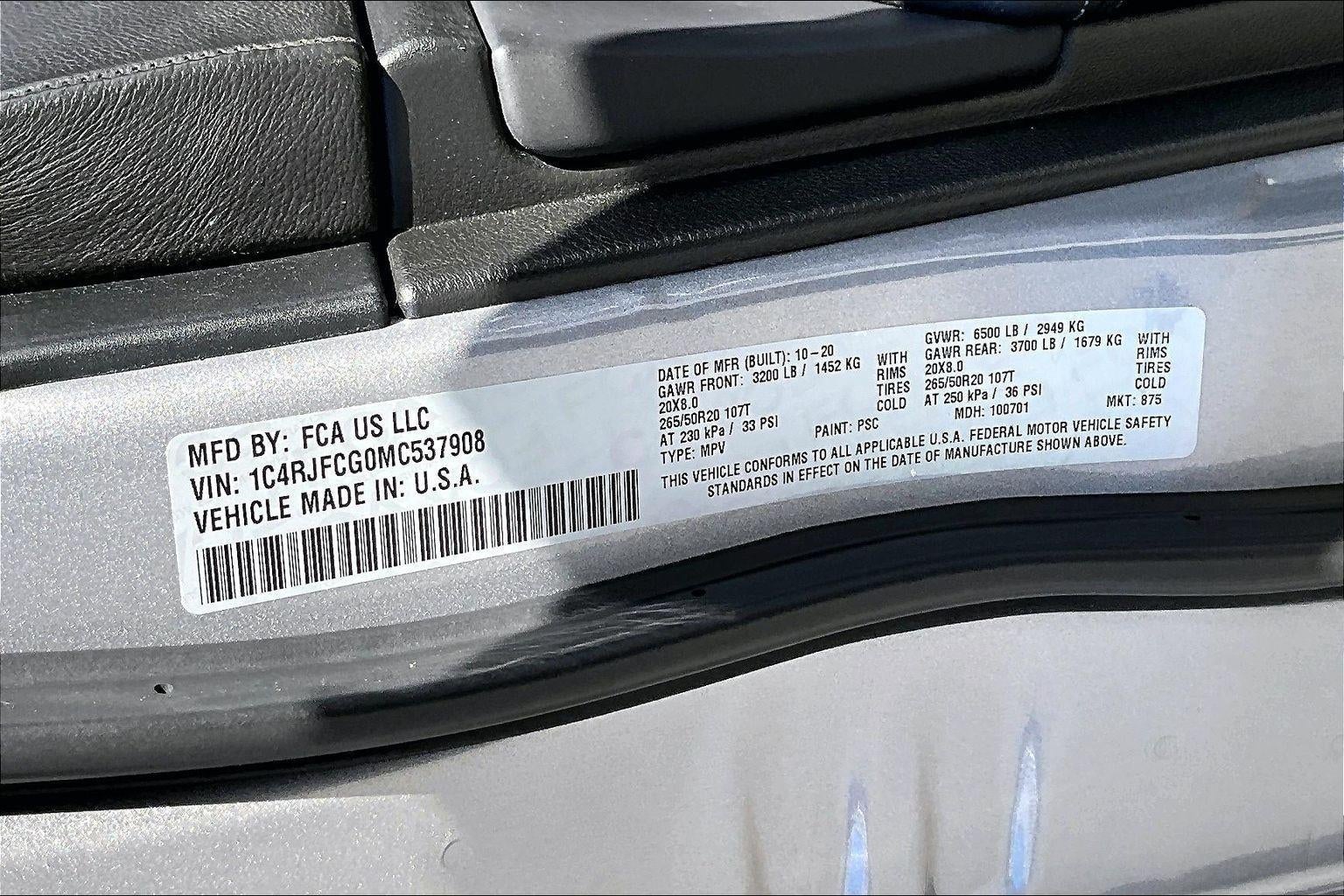 NORMAL DUTY SUSPENSION, ENGINE: 3.6L V6 24V VVT UPG I W/ESS, TRANSMISSION: 8-SPEED AUTOMATIC (850RE), QUICK ORDER PACKAGE 2BP, 3.45 REAR AXLE RATIO, WHEELS: 20"" X 8.0"" POLISHED/TECH GRAY ALUMINUM, TIRES: 265/50R20 BSW A/S LRR, BILLET SILVER METALLIC CLEARCOAT, BLACK, LEATHER TRIM SEATS W/EDGE WELTING, GVWR: 6,500 LBS, FRONT LICENSE PLATE BRACKET, 19 SPEAKERS HIGH PERFORMANCE AUDIO